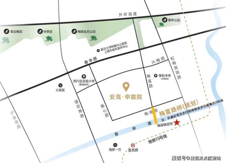 「安高申陇院」距离15号线景西路站直线距离仅约500米(来源于百度地图测距),未来春申塘建桥后,将迅速抵达地铁站,通达全程!
