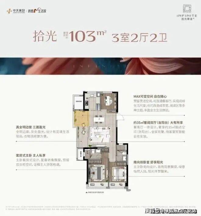 建面约103㎡的边套更是堪称神迹,将小户型的空间魔法玩到了极致。客厅到阳台的地面、天花直接拉通,甚至两侧的墙垛都已隐身,整个餐客厅面积达到约35㎡(含阳台),这可是140㎡以上大宅才有的空间感!