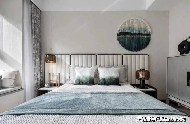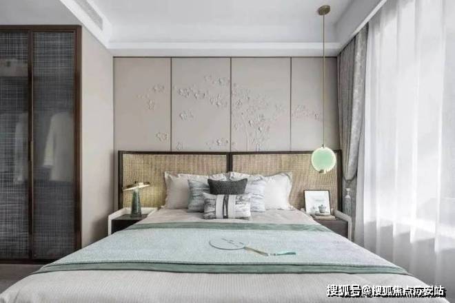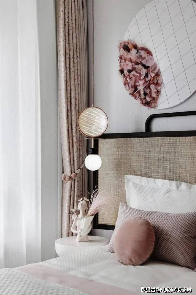 藤编式的大床,还有青色的灯具,都让整个主卧更有一派儒雅之美。