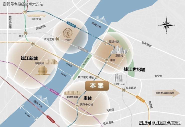 项目紧邻地铁2号线与6号线换乘站**钱江世纪城站**(步行约300米),600米覆盖盈丰路站(2号线&15号线),三桥三隧立体路网串联钱江新城、西湖等核心区域,形成“黄金三角”商务生活圈。