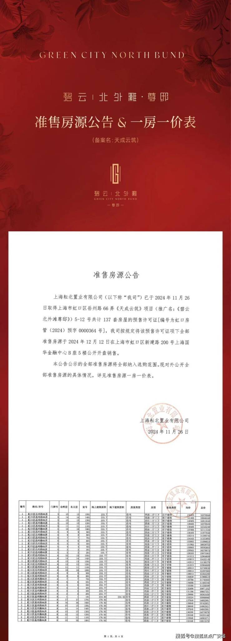 A small number of 4-bedroom units with a construction area of approximately 235 square meters are available for sale in the project. The average price of the entire project is 130,000 yuan per square meter, and the average price of the available units is 128,000 yuan per square meter. The total price ranges from 29.97 to 35.98 million yuan. The price list for each unit is as follows: