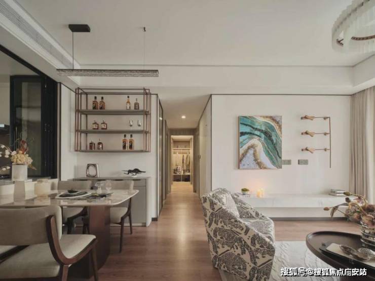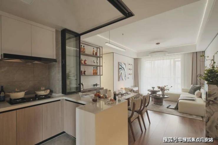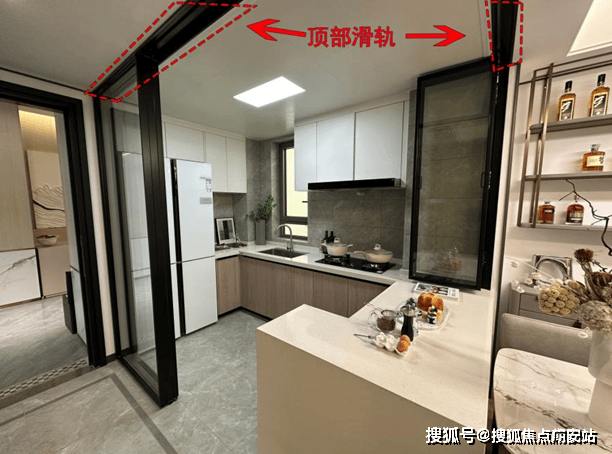 在细节之处显真章!譬如,餐厨的移门移窗为顶部滑轨设计,不容易形成卫生死角,而顶部滑轨兼顾了简洁美观的同时,也保证了地面卫生。并且,这种推拉门相较于平开门更不占空间,非常适合中小户型,细节非常到位。