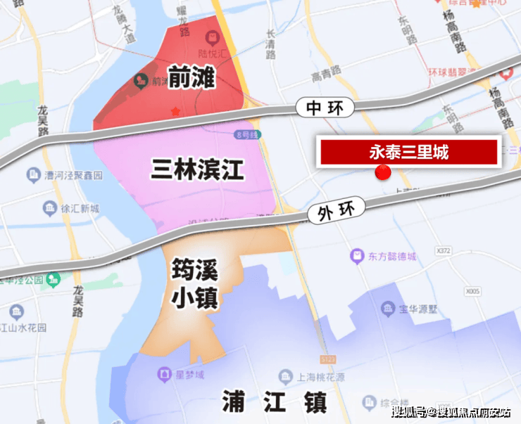项目所处的三林中部板块,和之前大热的三林滨江是两个不同的概念。三林滨江也就是大家口中的”前滩南“,是黄浦江沿岸三林段正在开发的地块。