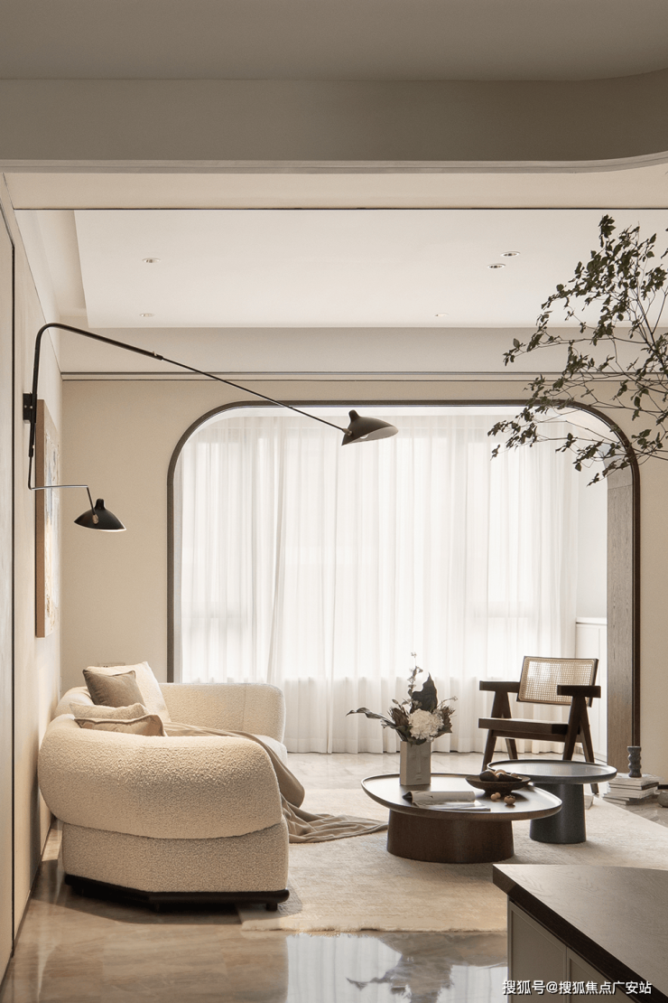 原户型玄关较空,客厅与餐厅之间也未合理过渡,整体缺乏大宅感,设计师重新规划布局,硬装上,采用轻法式设计,与原交付标准完美融合,柔和的家具线条与利落的硬装线条碰撞出一种平衡感。配色上,定位了温柔明亮耐看的大地色系,营造出温馨舒适的高级感氛围。