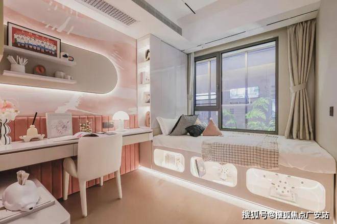 女儿房选取浪漫梦幻的粉色作为主色调,柔和明快,充满童真与童趣,小心翼翼地呵护两个女儿的公主梦。