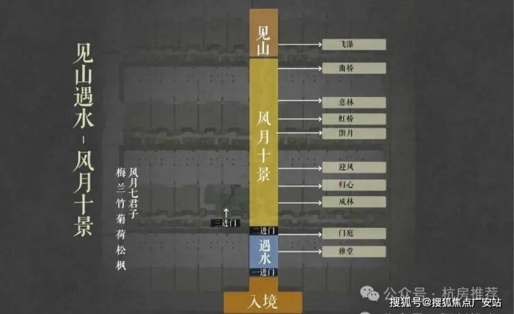 • 三进礼序中国人自古讲究归家礼序,门第之尊;久映颂月将传统中式建筑的礼序空间融入整体的规划布局中,形成一坊八巷-置坊入巷-穿巷入户的三重归家礼序。