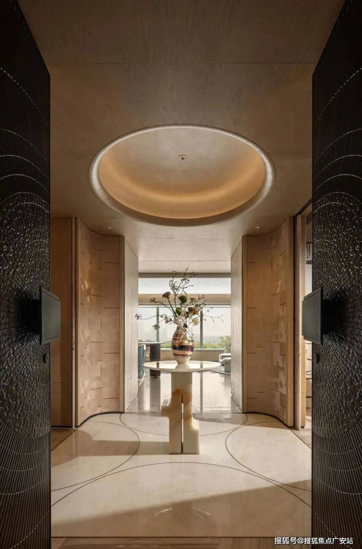 进入营销中心,更能体会空间美学:挑高8米的大堂搭配银色水波纹天花,宛如时间的涟漪,与绿植相互映衬,为空间增添了灵动感和节奏感,营造出充满未来感的艺术氛围。