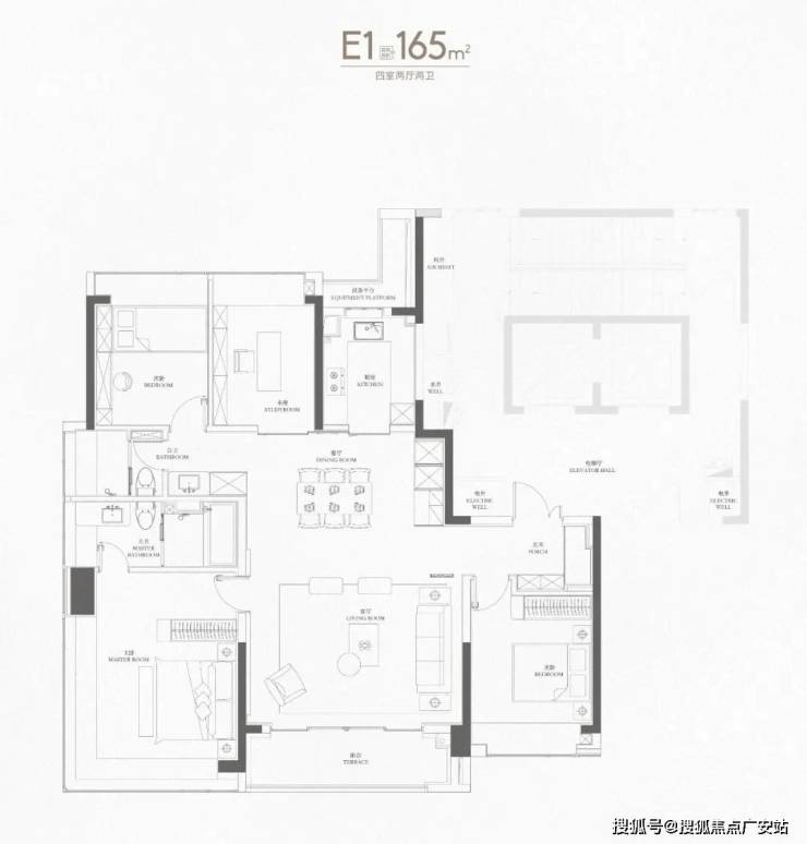 188户型2梯2户,有独立的电梯厅。4房3卫设计,还是3明卫,这两点还是不错的。