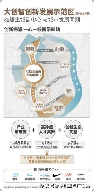 江湾五角场和新江湾城共同构建了大创智创新发展示范区。形成了世界级的产业集群,是 “产业浓度、人才浓度、创新生态” 兼具的创新功能聚集区。