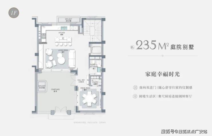以建面约235㎡的庭院别墅样板房为例,户型附赠地下室、庭院、露台、阁楼空间,附赠面积达到户型总建面的60%左右,市场上少之又少!