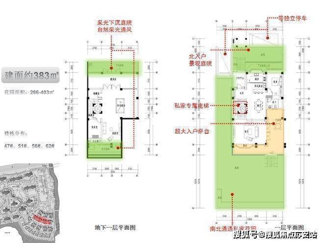 一层南北入户都带景观庭院,超大入户平台+独立停车+专属私家电梯,客厅开间约6.6米,地下室打造采光下沉庭院,改造空间非常大。