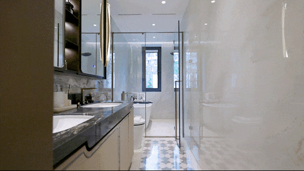 南向双主套均配备独立卫浴与全景飘窗,主卧卫浴更是采用“双台盆+浴缸+淋浴区”的三段式布局,媲美五星级酒店;