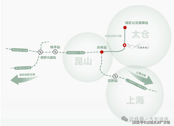 路轨纵横 驰骋长三角动脉项目邻靠前进路、胜泾路、烟沪线(204国道),便捷接入两高(京沪/沈海高速),同频太仓“5+1”轨道交通网络(建设中),公交路线312路自江南禾风站,向西链接苏州轨交11号线,向东至科教新城客运站换乘60路,102路,112路,128路,以多维立体交通便捷出行长三角。(资料来源于太仓发布官微)