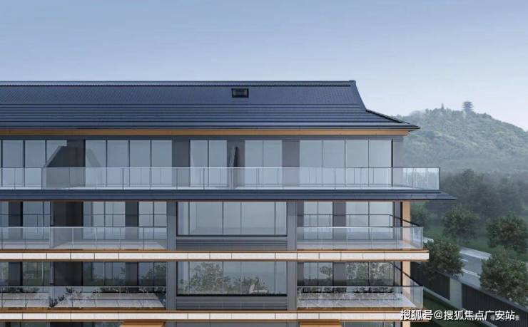 颂香望庐的建筑外立面沿袭传统宋式美学,采用四面铝板+三玻两腔玻璃立面,搭配爱马仕灰和蓝眼睛石材,古典但不失现代质感。建筑采用了“更具辨识度”的坡屋顶,保留了飞檐、歇山顶、窗棂等元素。
