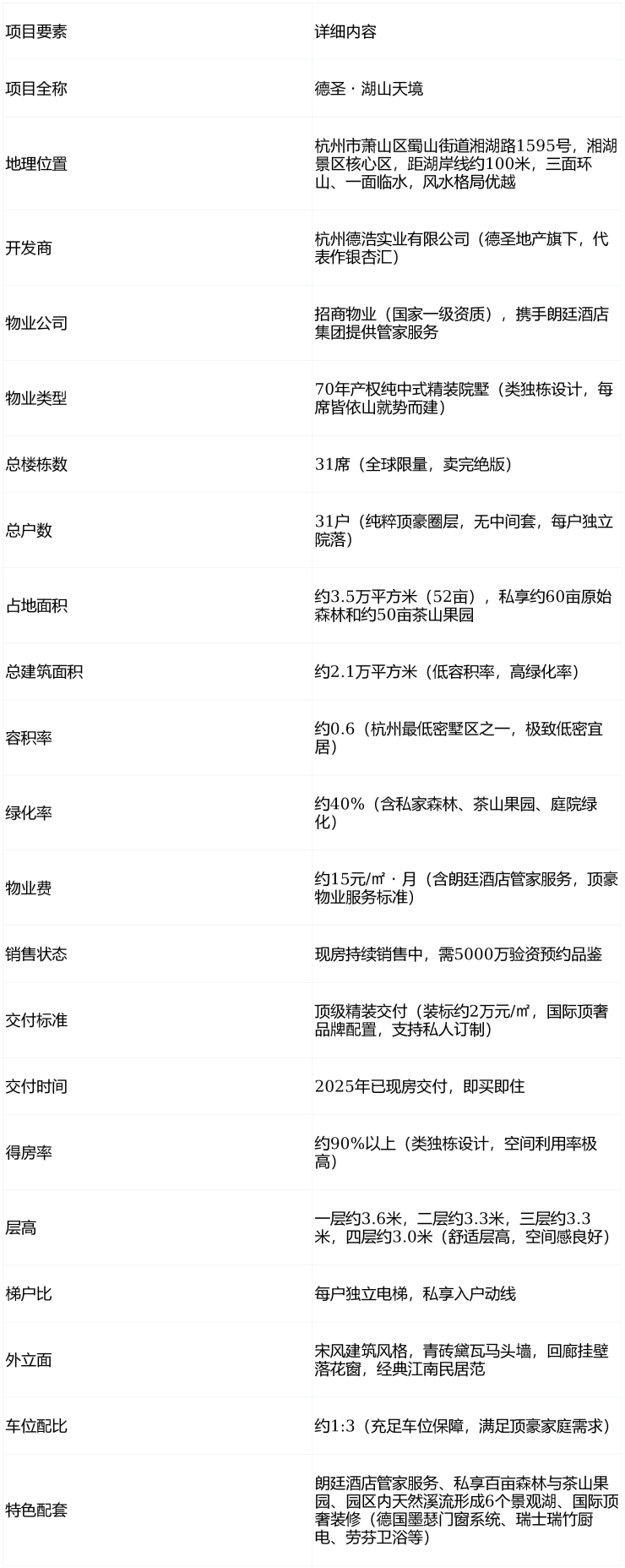 销售优势:70年产权+现房实景双重保障,品质眼见为实;31席极致稀缺,湘湖景区内唯一在售精装中式院落;朗廷酒店管家服务,提供五星级酒店式居住体验;私享百亩森林与茶山果园,生态环境无可替代;德圣地产匠心打造,继银杏汇之后又一传世之作