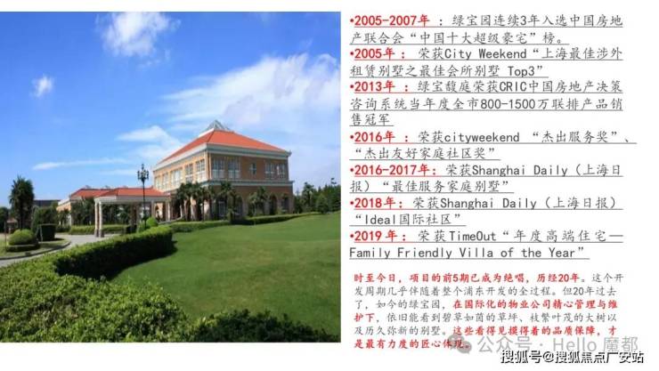 绿宝园别墅位于南汇康桥开发区,奠基开工于1999年,占地近40万平方米,迄今共推出5期产品及“绿宝.馥庭”,经过多年的开发已成为上海成熟高档的别墅社区之一,曾连续三年被评为“亚洲十大豪宅”,其多年来以纯正的美式规划,美式物管等西方的概念和执行。项目从规划之初即定位于打造具有北美风格、以外籍客户为主的涉外高档社区,在知名规划与设计团队的主导下,致力于高标准的设计、高品质的建筑、经验丰富的管理团队为住户提供全新的生活标准。