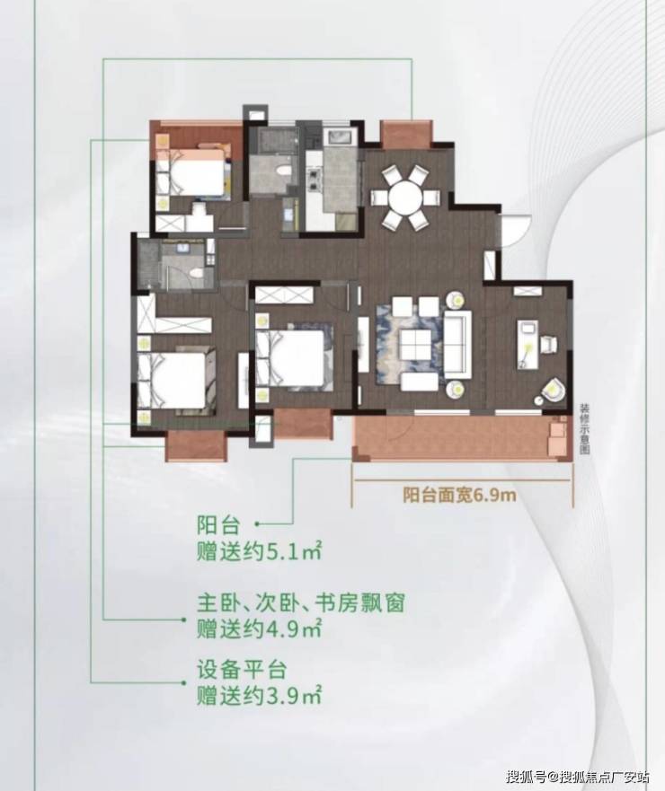 品质细节:2.95米层高,部分户型配备观景飘窗和双卫设计