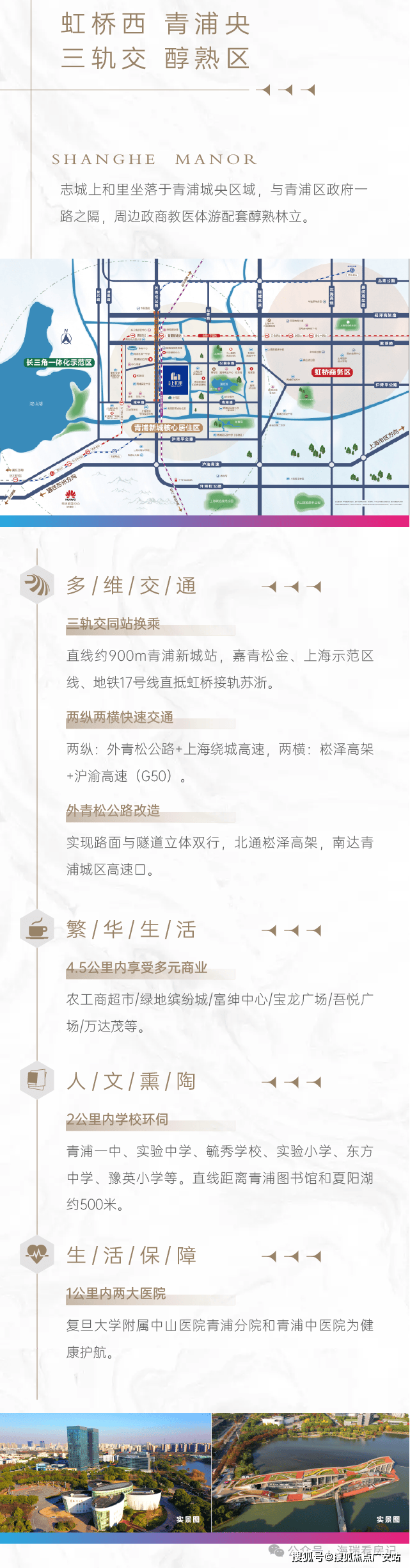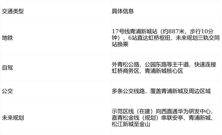 🚇便捷交通网络:距17号线青浦新城站约887米,步行10分钟可达,未来规划三轨交同站换乘(17号线、示范区线、嘉青松金线),6站直达虹桥枢纽,快速连接市区。