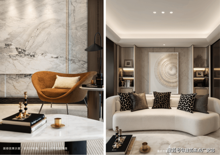 客厅背景墙的“烟雨江南”天然大理石,不同于传统平面背景墙,通过弧度及立体的造型处理,并镶嵌不锈钢材质,对于金茂而言,比奢石昂贵的,是让奢石真正与空间气场融为一体。