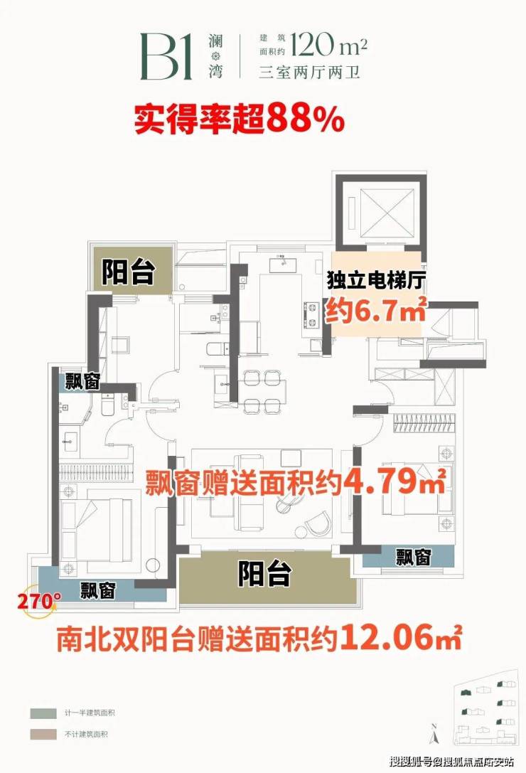 建面120㎡B1户型,约12㎡南北双阳台空间,阳台“买1赠1”,赠送约6㎡,次卧拓展后都有舒适尺度,更附赠约4.79㎡飘窗,实得率超88%。