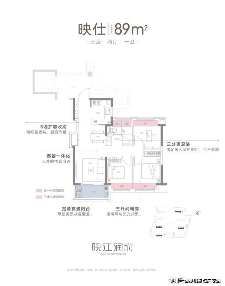 其次是 户型设计。 在户型产品同质化严重的当下,映江润府花更多心思在户型创新设计,给到置业者更美好的家的体验。建筑面积约89㎡王炸小豪宅户型,拥有四大高光细节和创新设计,在市面上同类产品中非常能打。