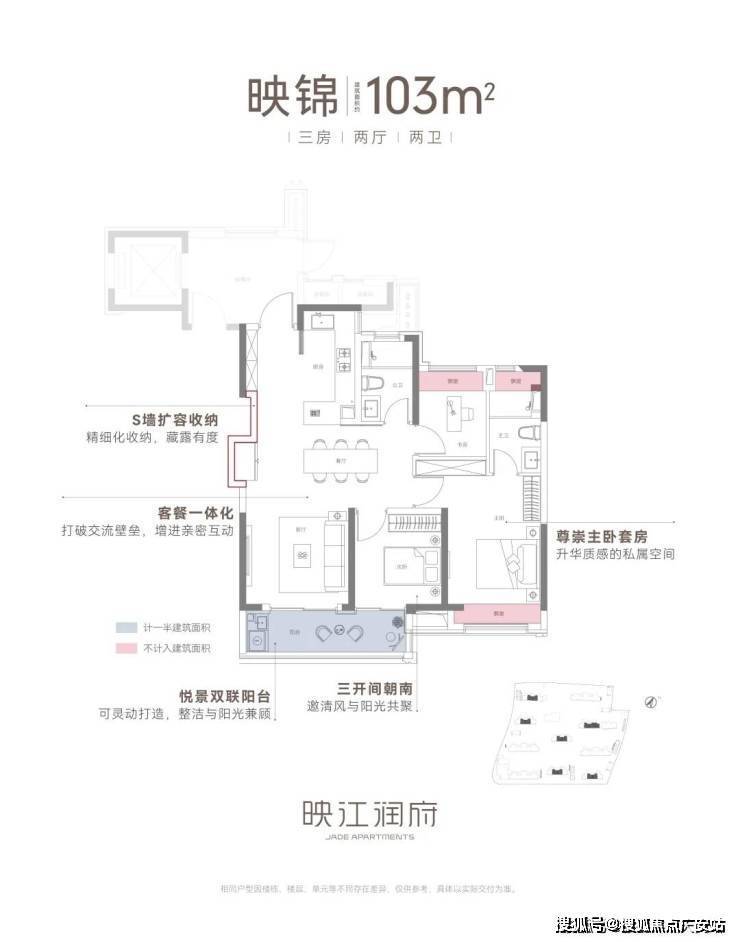 建筑面积约103㎡三房两厅两卫,不失为改善家庭的首选。其中边套户型,映江润府的主卧套房 做了 270°环幕飘窗, 实现无与伦比的采光通风和视野享受,类比于千万级豪宅的体验!