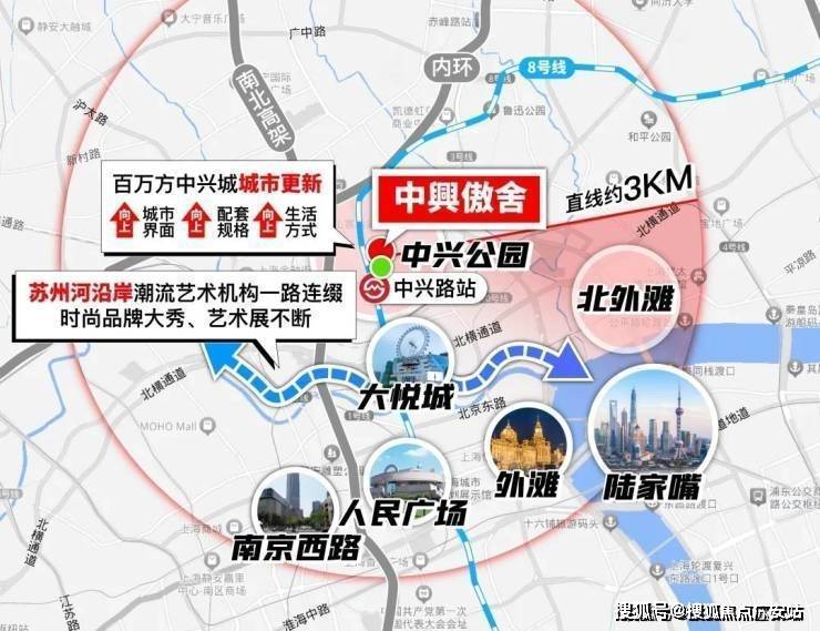 相较于虹口、杨浦,中興傲舍占据天然地理优势,以项目为中心直线距离约3公里范围内,南京西路、人民广场、外滩、外白渡桥、陆家嘴等城市地标星罗棋布.