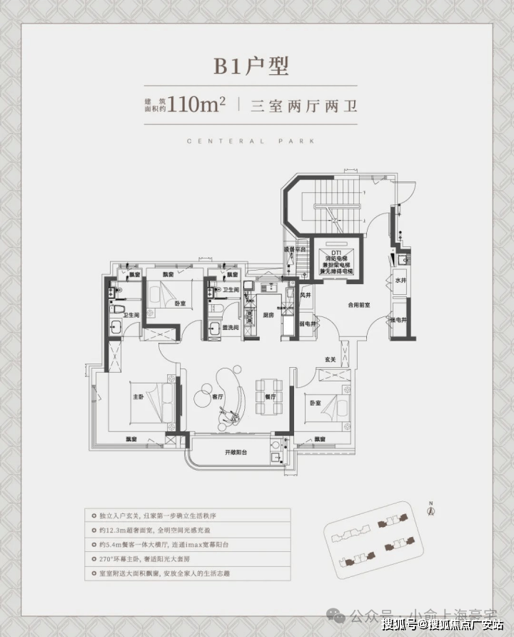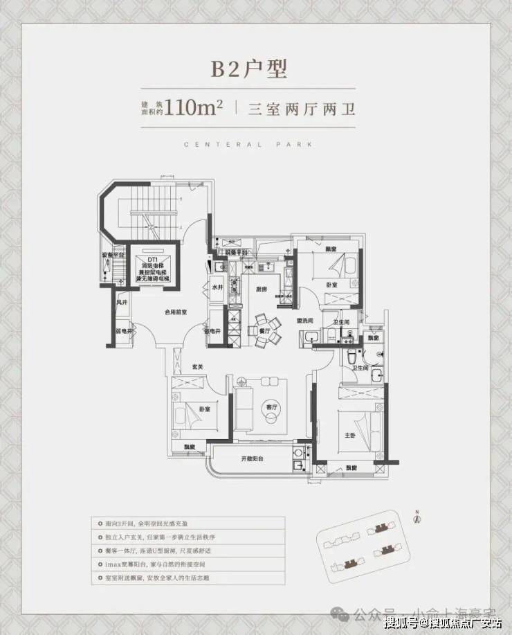建面约110㎡中间套竖厅户型,同样也是标准的南北通透飞机户型,整体室内的采光、尺度感、通风都相当出色。非常适合一家三口、年轻夫妻的全生命周期需求!
