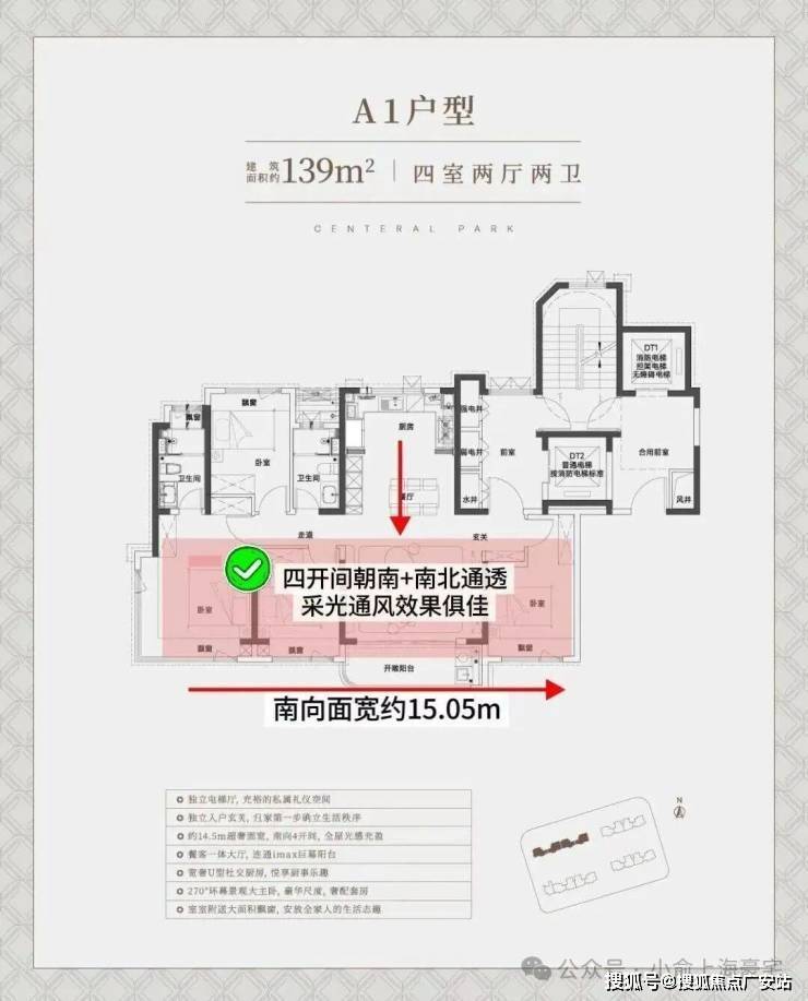 中环铂樾建面约139㎡的户型(西边套),独立电梯厅+罕见的大横厅设计,大面宽短进深,约15.05m的南向奢阔面宽