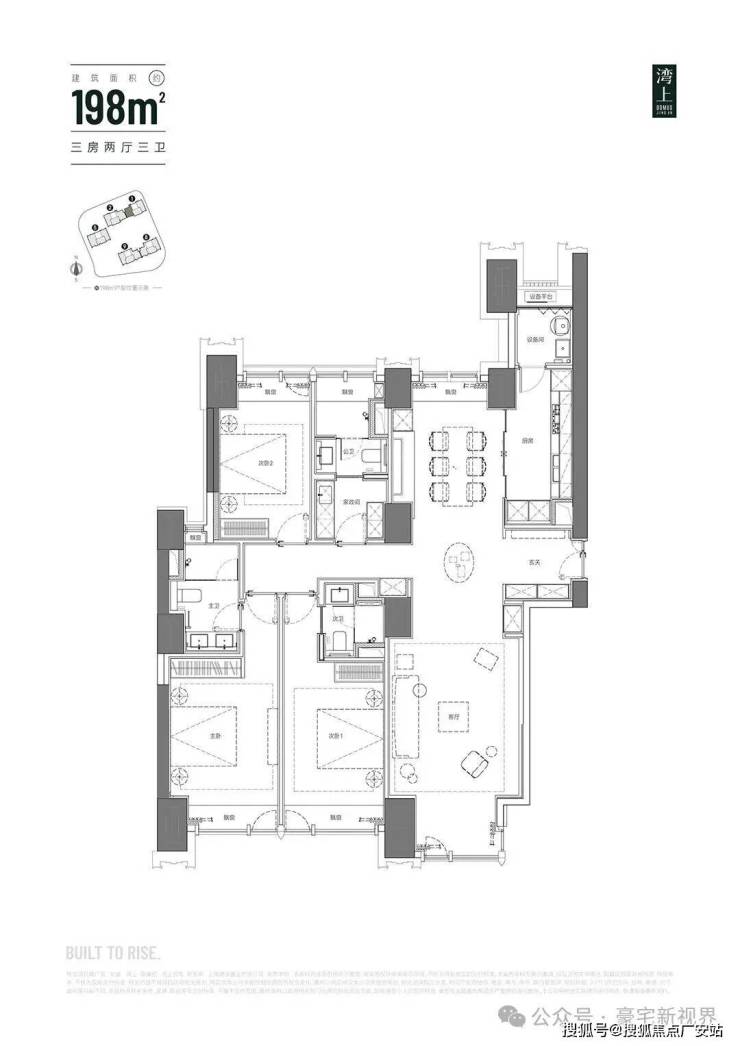 住宅部分:由3栋超高层住宅(约132-150米高)和约1.3万平方米的低密度风貌别墅组成,住宅总建面约13万平方米,可售房源共576套。