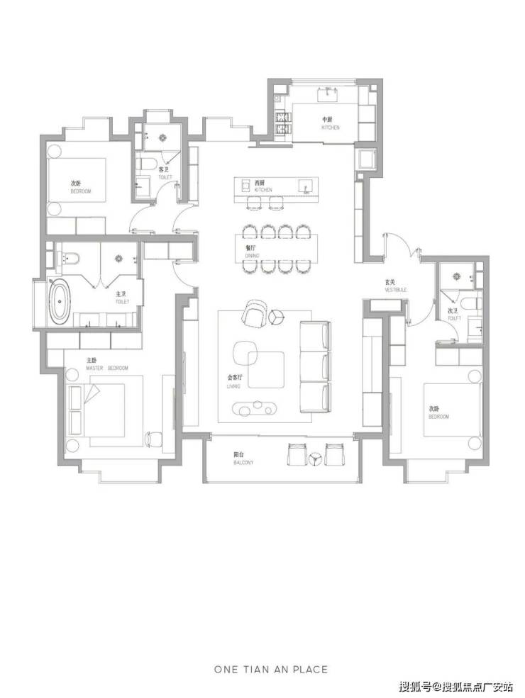 厨房、餐厅、客厅及阳台一体化设计,尺度感十足!