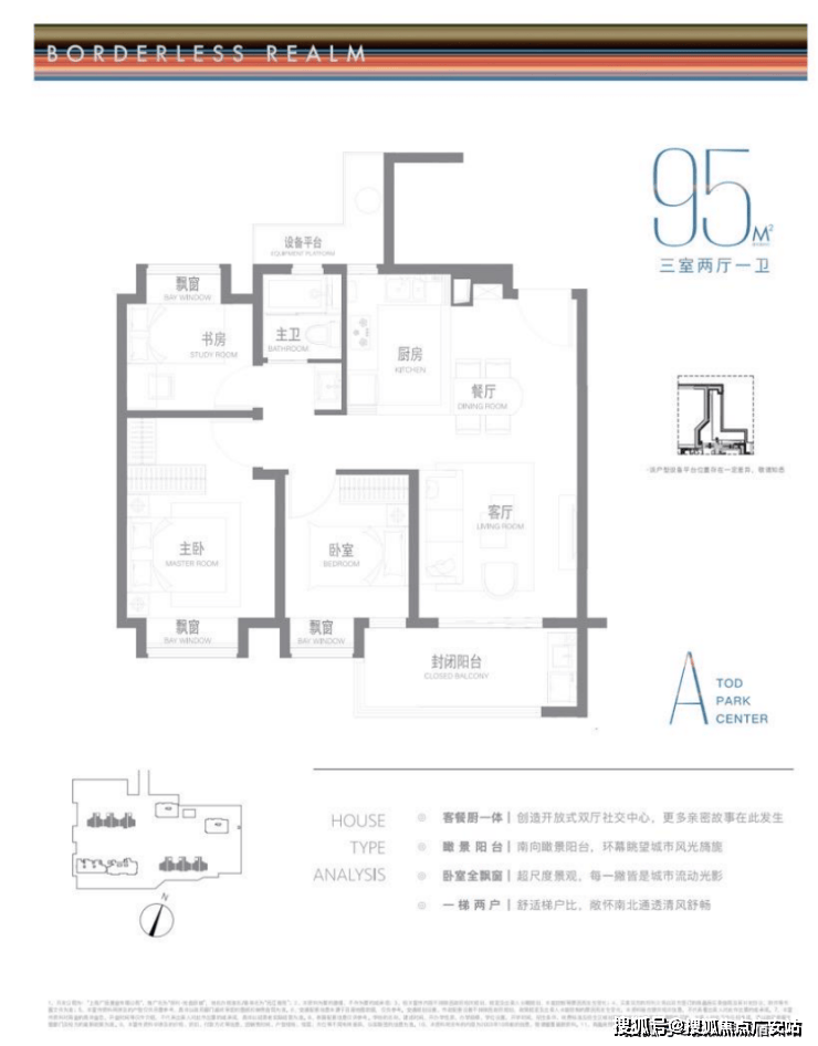 建面约95m²户型特点:开放式厨房,极度释放厨房与客厅的尺度与互动可能,无连廊设计,一梯两户极致梯户比,南北通透舒适感