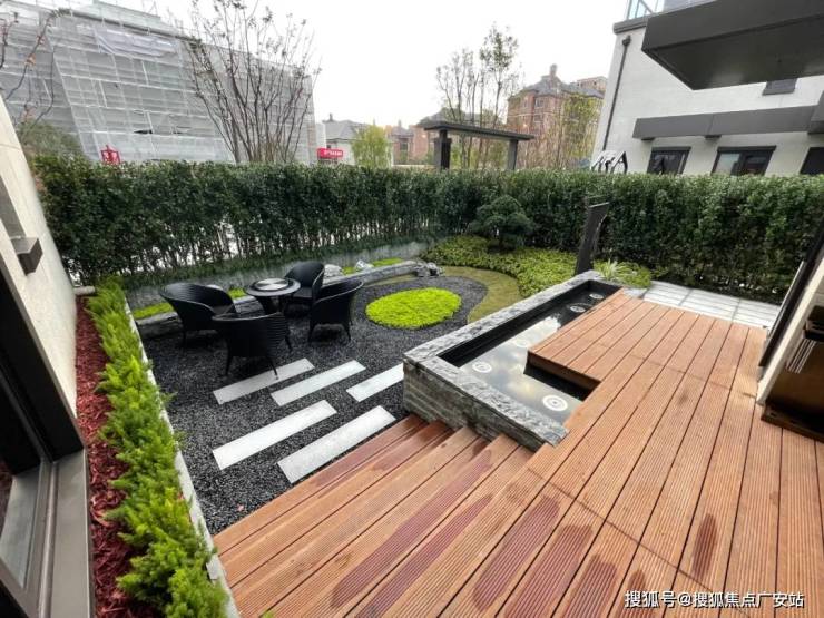 建筑外观上是新中式格调,以黑色面瓦为黛顶,整体线条简洁明快。0.86容积率,带来更低的人居密度、更好的采光,还意味着将更多留白空间给了景观。比如打造一系列公共设施,石凳、石桌、洗手钵、锻炼器械等,满足业主的休闲娱乐需求。