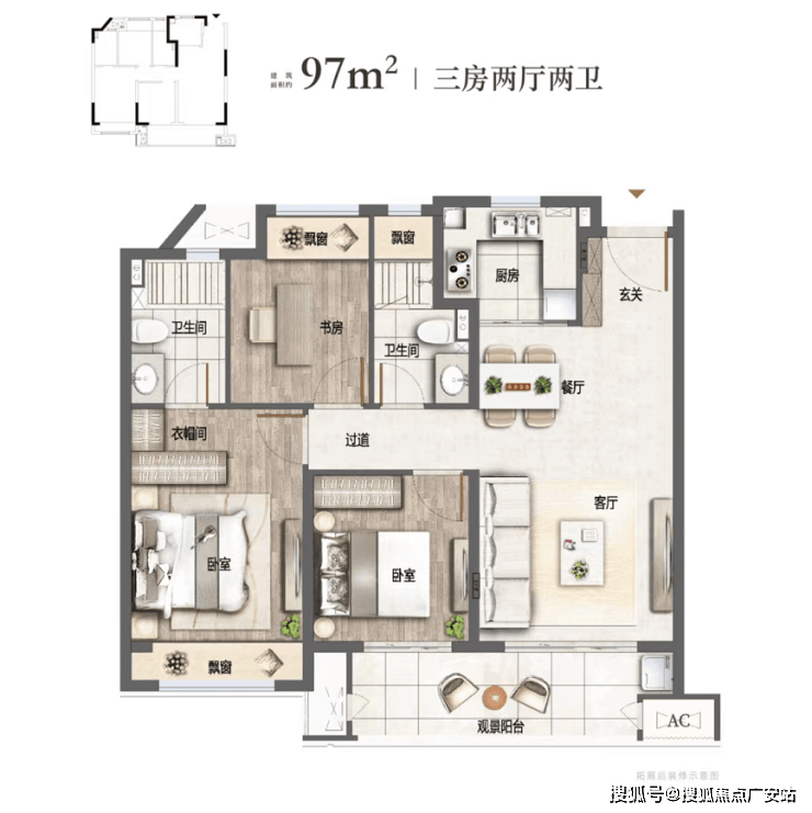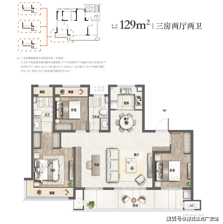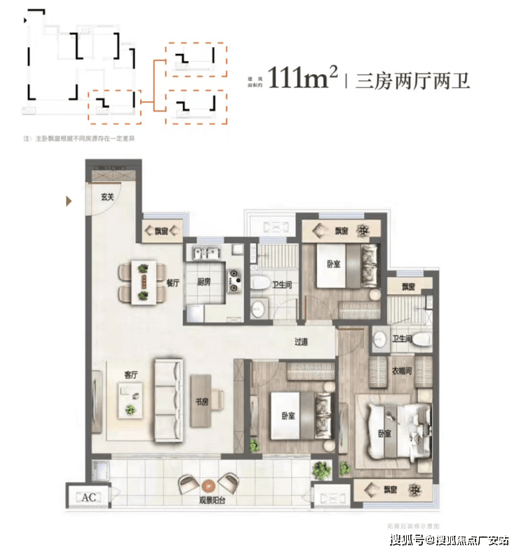 建面约111㎡的户型更是做了进一步升级,客厅采用横厅设计,餐厨一体和客厅互不干扰,主卫飘窗,值得注意的是,在餐厅北部还增设了北飘窗,让人眼前一亮,这样一来通透性更佳。