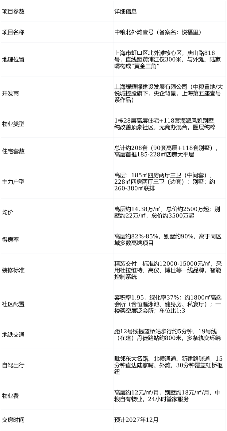 中粮北外滩壹号是上海北外滩核心区稀缺的央企顶豪江景住宅,核心价值在于北外滩区位+一线江景+低密社区+高得房率的组合优势,适合预算2500-5000万、追求江景生活与高端圈层的高净值家庭。