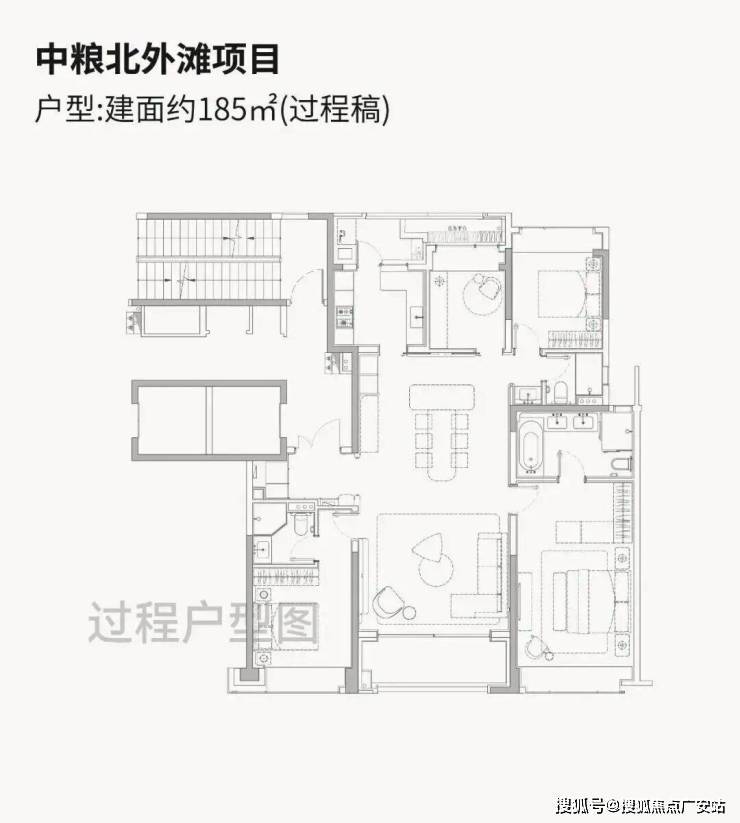 228㎡边套采用大横厅设计(面宽约8-9米),双套房布局,三南一北朝向,采光通风佳
