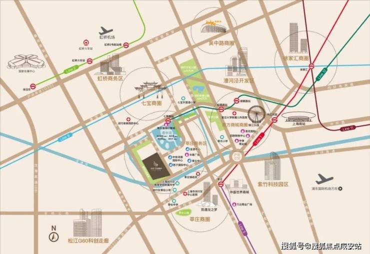 轨道交通方面:项目距离12号线七莘路站步行约1200米,进站直达南京西路,未来七莘路站还明确了继续向西延伸的建设方向。自驾方面,由于地处外环高架和嘉闵高架之间,坐拥七莘路和顾戴路两条快速路也使得开车出行也十分方便,