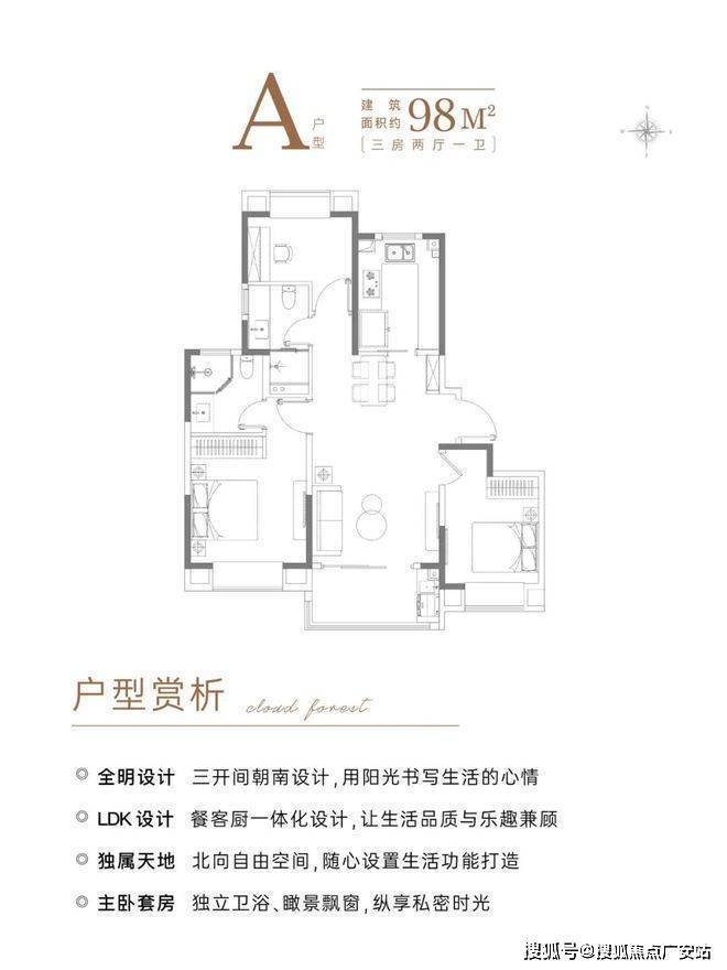 约98㎡3房2卫的爆款飞机户型,南北通透+三开间朝南,整体室内的采光、通风都做到了极致。