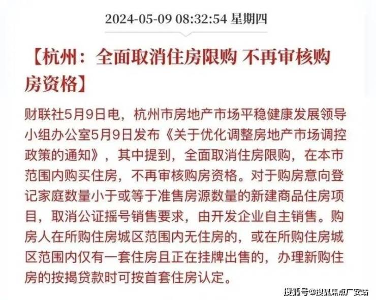 "杭州优化房地产调控新举措:即2024.5.9日起,所有区域住房交易无需审核购房资格,限购政策正式退出。"