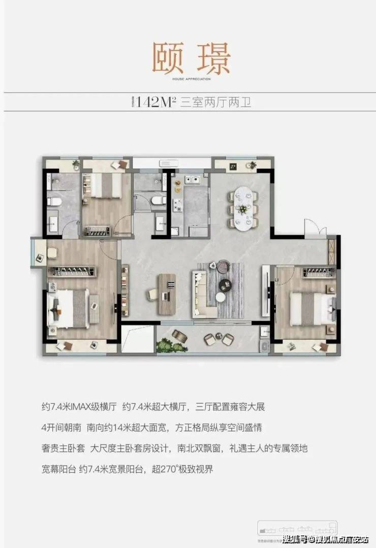 户型点评:两条天然河道从中建颐璟臺北侧和西侧蜿蜒流过,而140平这个户型最大的特点就是增加西侧开窗设计,整个房型三面采光,不但提升房间采光通风,更能完美拥有西侧北侧双河视野,一线河景尽收眼底。