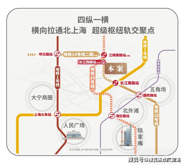 宝山淞南板块,曾被视为城市发展的“隐秘角落”,如今却因18号线的贯通与北中环交通网的完善,蜕变为上海北部的“超级枢纽”。地铁18号线横向拉通了原本纵向不相连的四线地铁:1/3/18/19,将北上海横向联通,成为区域轨交的交汇聚点;项目紧邻长江西路地铁站(直线距离约150米),1站江杨南路,5站复旦,7站五角场。