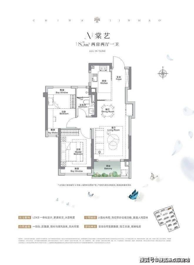 上海宝山金茂棠前营销中心热线4008657114(官方预约热线)建面约85㎡2房2厅1卫,做到了双开间朝南+3个飘窗+LDKB一体化设计,附加空间非常多。