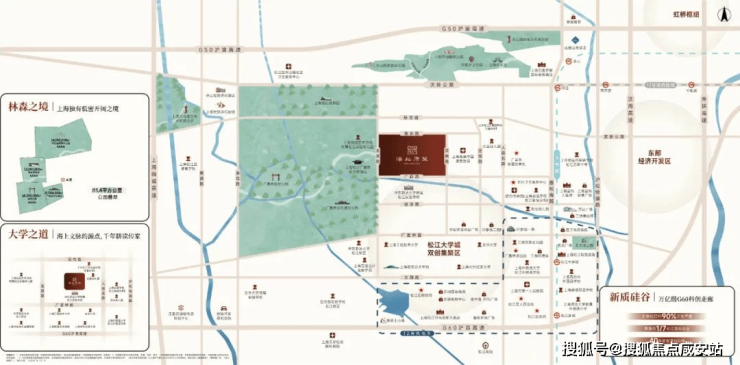 而项目的南面松江大学城7所高校如星辰汇聚,十余万师生在此激荡思想——这里是人才的熔炉,创新的策源地。更与G60科创走廊共振,人工智能、生物医药、量子科技等前沿产业在此蓬勃生长,科技之光正重塑时代的天际线。