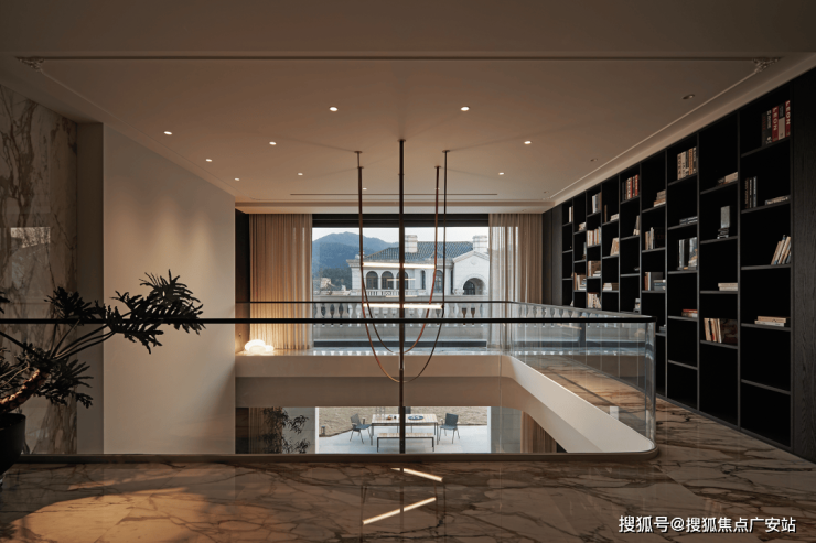 房子内部以“垂直生长”回应家族生命周期。一楼作为家庭社交中枢,6米多高的挑空客厅以卡拉卡塔金大理石纹为幕,石材纹理如水墨恣意流淌,灰色的手工地毯以“时光的褶皱”为精神内核,与Minotti的家具构成刚柔对话。