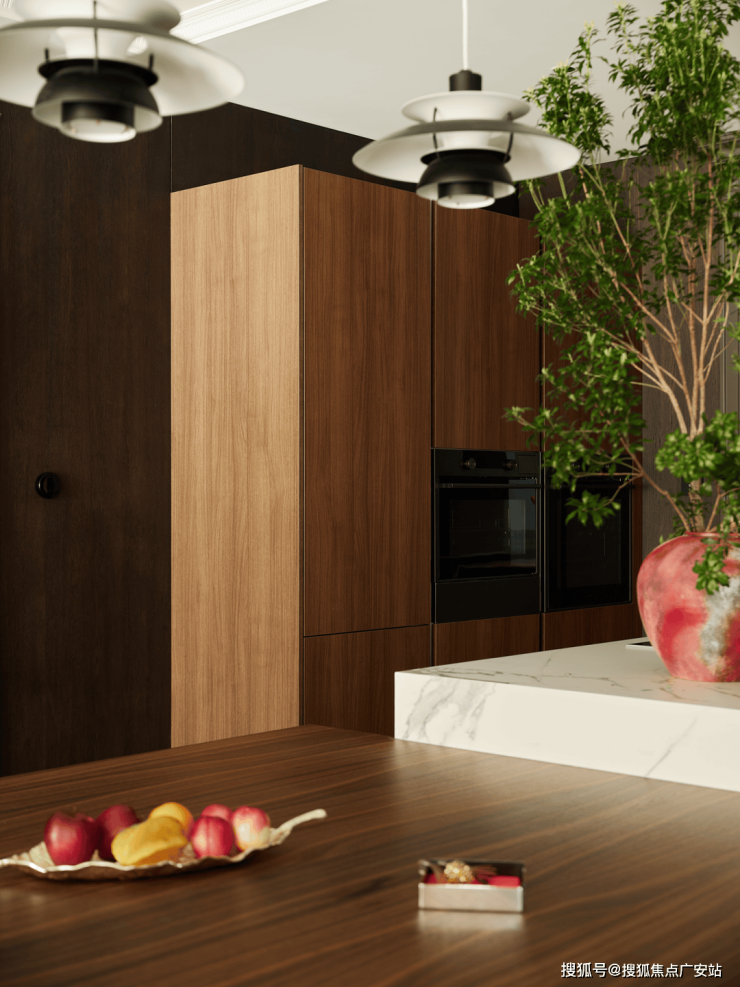 中西双厨选用Dada橱柜,岛台延伸作为早餐和休闲区,10人位的圆形餐桌,暗合东方“团圆”意象,落地窗将客厅、餐厅、茶室与南花园串联为流动的整体。