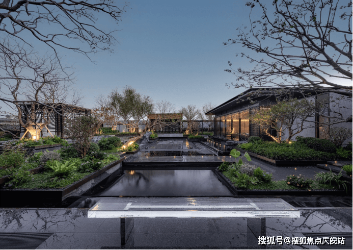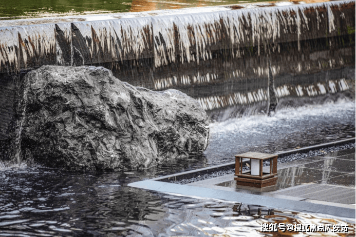 又比如,项目延续了张园“引水入园”的理念,将长200m近1000m²的水系覆盖到整个社区内。水景形态各异,有中心静水、三层跌水、点状涌泉、立面叠瀑、弧形流水五大不同呈现方式。水系的引入,让整个社区彻底灵动飘逸了起来。