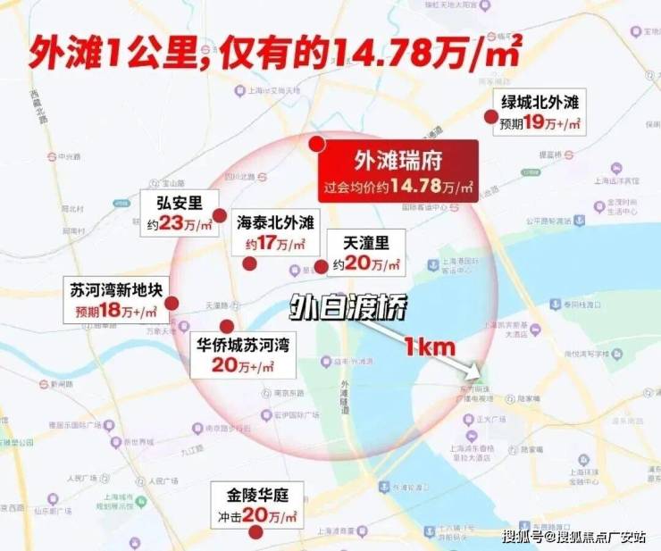 其次,在距离外滩1公里范围内,楼盘单价普遍达20万/㎡,只有外滩瑞府给出14.78万/㎡的上车机会。