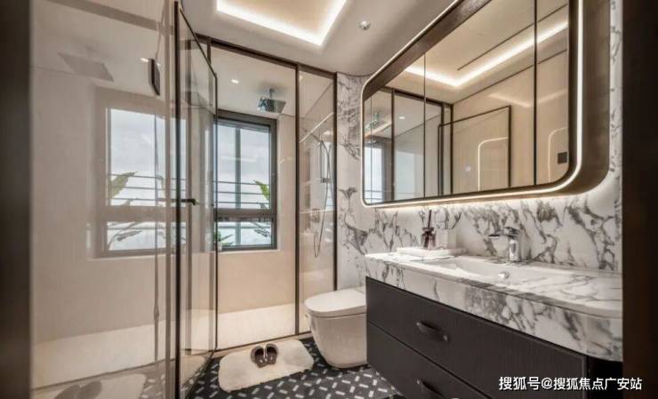 大理石地砖的铺装工艺精湛,近乎看不出拼接缝,呈现出浑然一体的效果;吊顶采用悬浮顶设计,周边用金属包边,层次感十足;卫生间墙面不乏弧形处理,地板纹路的拼法也各有不同,通过复杂的工艺,只为呈现更优的视觉效果。