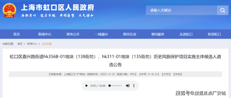 2022年12月23日 虹口区人民政府网发布了关于嘉兴路街道hk356B-01地块(138街坊)、hk311-01地块(135街坊)历史风貌保护项目实施主体候选人遴选公告。