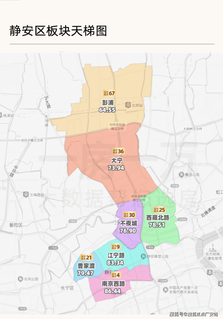 新静安借助产业政策和土地储备快速崛起,逐渐撕去闸北的"下只角"标签,大宁、苏河湾也一跃成为新兴中产及高端居住区。而老静安受限于城市界面老旧和更新缓慢,逐渐显露出疲态。